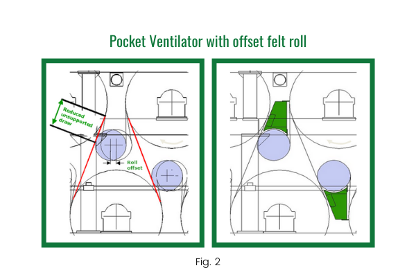 Once the sheet leaves the single-tier section and enters the first top and bottom felt dryer section, the sheet is still susceptible to breakage, although drying has taken place in the previous sections. To minimize draws, the pocket felt rolls are offset to the wet end to reduce the open draw by more than half to obtain optimum runnability. Specially designed offset pocket ventilators are installed to hold the sheet to fabric and ventilate the pocket.