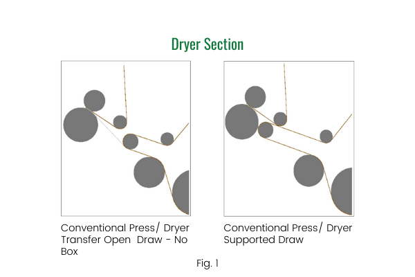 To solve this problem, it is necessary to close up draws and support the sheet as much as possible. The areas to be addressed first are those where the sheet is most susceptible to breaks, closer to the wet end, where the sheet is the weakest. For the past decade, the first step was advancing from straight through open draw presses to the top, and bottom felted presses and eventually extended nip press (ENP), where the sheet has minimal open draws. (See Fig. 1 & 2)